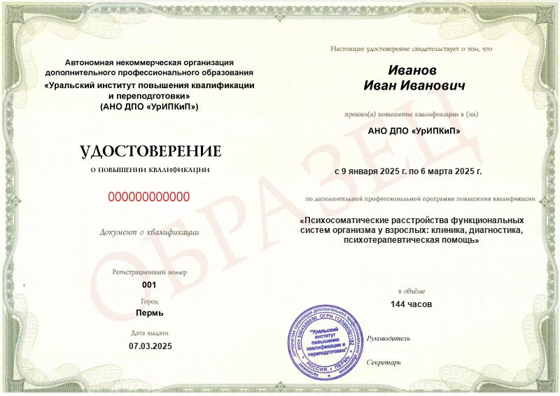 Курс обучения Психосоматические расстройства функциональных систем организма у взрослых: клиника, диагностика, психотерапевтическая помощь (144ч)