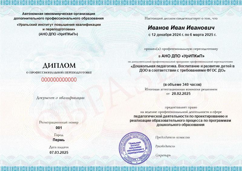 Да, дипломы и удостоверения оформляются в соответствии с действующим законодательством РФ. Документы печатаются на специальных бланках, заверяются печатью АНО ДПО «УрИПКиП».